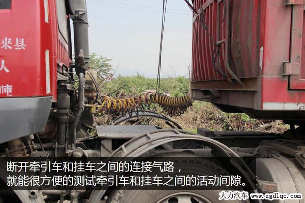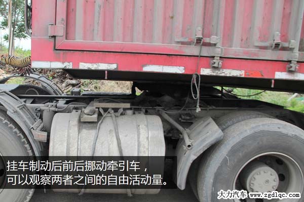 兩人配合,一個人駕駛牽引車向前、向后反復(fù)活動幾次,另一個人在旁邊觀察牽引盤和掛車是否有相對的間隙,如果有很容易就能觀察的到。