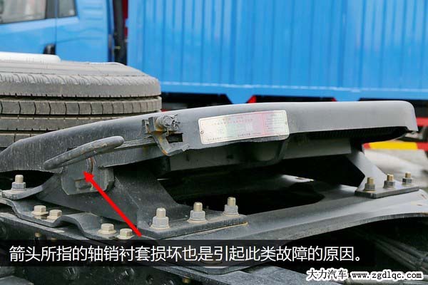另外牽引鞍座本身上下部分的結(jié)合點也需要觀察,因為鞍座的上下部分是靠一個軸銷來固定的,軸銷外有軸套,一般是橡膠或者尼龍材質(zhì)制造的,如果軸套損壞也非常容易出現(xiàn)竄動量大導(dǎo)致有沖擊感。