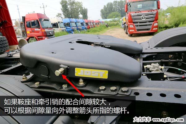 如果斷定牽引鞍座相對掛車有較大的間隙那該怎么辦呢?不用著急,這個毛病一般都很好處理,牽引鞍座左側(cè)有一個可以調(diào)整的螺桿,但一般人都不知道它是干什么用的,其實它就是調(diào)節(jié)牽引鞍座工作間隙的裝置,向內(nèi)擰螺桿間隙變大,向外擰間隙變小,大家可以根據(jù)自己車輛牽引盤的間隙進行適當(dāng)?shù)恼{(diào)整,但要千萬記住調(diào)整后鎖緊螺母。如果是牽引盤上下鉸接部分的軸套間隙大了就只能拆解進行軸套和軸銷更換維修了,但此類配件一般都比較便宜,維修成本不高。