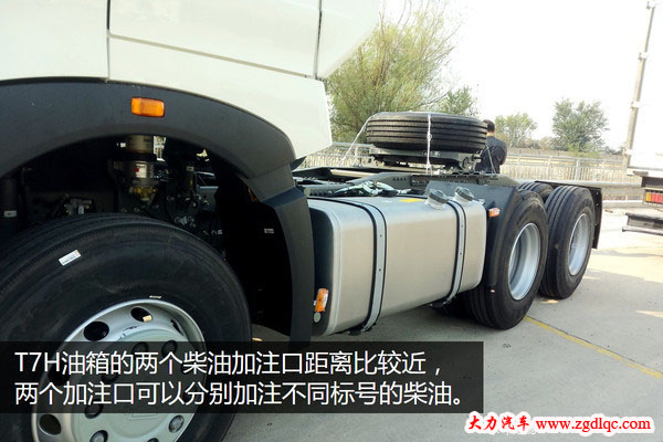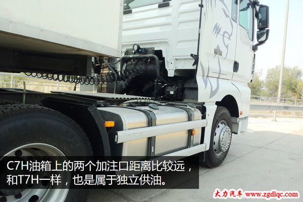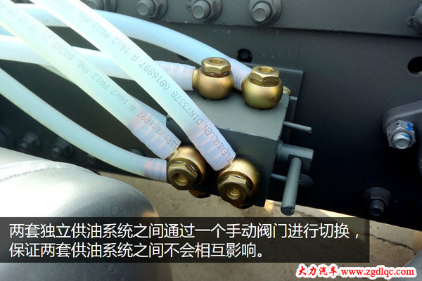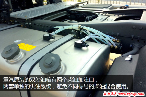 今日,大力汽車從中國重汽了解到,目前T7H和C7H都可以裝配雙腔油箱,通過一個(gè)簡單的控制閥門就可以實(shí)現(xiàn)兩個(gè)油箱之間的任意轉(zhuǎn)換。