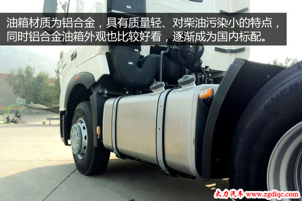 油箱采用鋁合金材質(zhì),具有質(zhì)量輕、對柴油污染小的特點(diǎn),也是目前國內(nèi)重卡的主流配置。同時(shí)原裝鋁合金油箱在外觀上也比較美觀,看起來更加的漂亮。