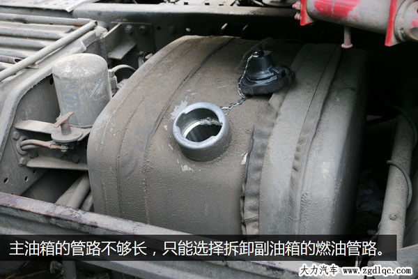 黃師傅的解放J6裝有一大一小兩個油箱,分為在車架的兩側(cè),一開始我們選擇拆卸主油箱的出油和回油管,但是發(fā)現(xiàn)油管的長度不夠長,所以只能選擇拆卸油管相對長一點的副油箱油管來進行測試。
