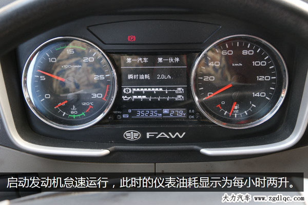 黃師傅的這臺解放J6裝配的是錫柴6DM2電控發(fā)動機,11升排量420馬力,駕駛室內(nèi)的儀表能顯示出發(fā)動機的瞬時油耗,啟動發(fā)動機后發(fā)動機轉(zhuǎn)速穩(wěn)定在650轉(zhuǎn)左右,油耗顯示為每小時2升,但是電子儀表都有一些誤差,最終的數(shù)據(jù)還要看我們的實驗結(jié)果。