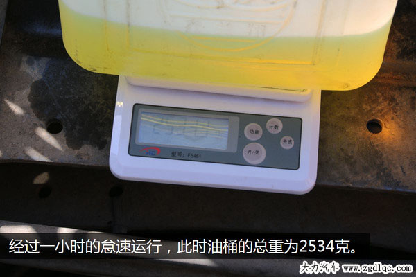 測試時間為一個小時整,到時間后我們立即關(guān)閉了發(fā)動機,此時油桶內(nèi)的柴油相比剛開始測試的時候下降了大約一半左右,但這只是目測,最終的精確結(jié)果需要通過稱重來測量。
