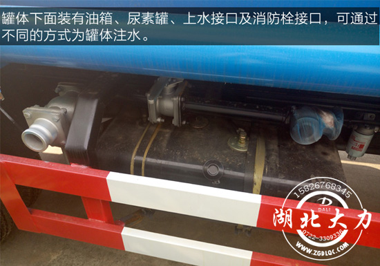 罐體下面裝有油箱、尿素罐、上水接口及消防栓接口,可通過不同的方式為罐體注水。