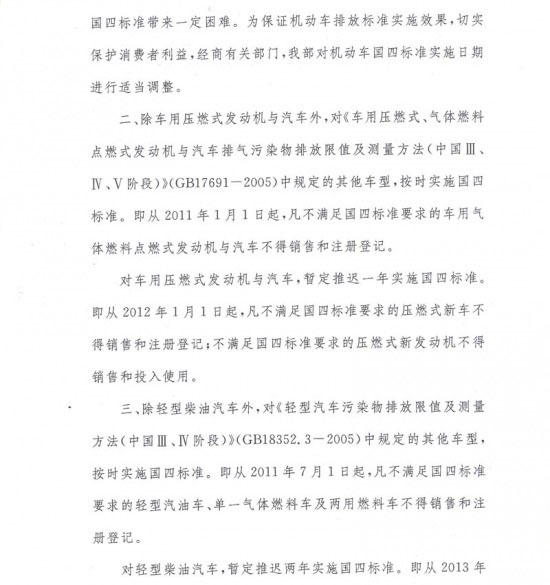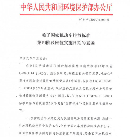 為此,中國(guó)汽車(chē)工業(yè)協(xié)會(huì)在聽(tīng)取汽車(chē)行業(yè)多數(shù)企業(yè)意見(jiàn)和建議的基礎(chǔ)上,向國(guó)家環(huán)境保護(hù)部反映了該標(biāo)準(zhǔn)推遲實(shí)施的建議。 中國(guó)人民共和國(guó)環(huán)境保護(hù)部辦公廳于2010年12月21日以環(huán)辦函【2010】1390號(hào)《關(guān)于國(guó)家機(jī)動(dòng)車(chē)排放標(biāo)準(zhǔn)第四階段限值實(shí)施日期的復(fù)函》函復(fù)中國(guó)汽車(chē)工業(yè)協(xié)會(huì),F(xiàn)將函復(fù)內(nèi)容轉(zhuǎn)告全行業(yè),請(qǐng)行業(yè)嚴(yán)格按照國(guó)家要求認(rèn)真執(zhí)行。