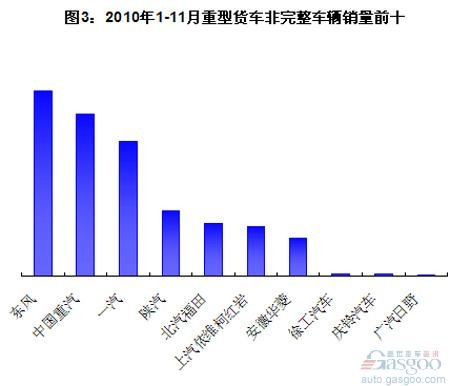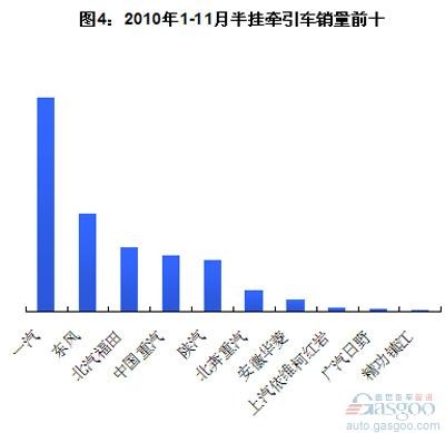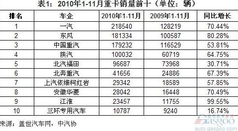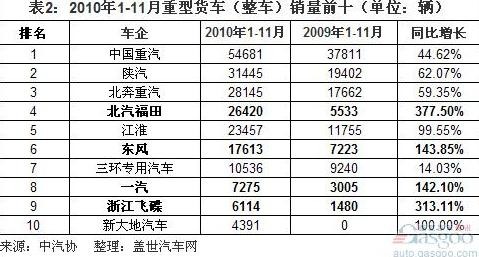 2010年1-11月,中國重卡(含整車、非完整車輛和半掛牽引車)銷量同比大增64.45%至94.18萬輛。其中,重卡整車和半掛牽引車的銷量增長率最高,分別同比增長87.68%和79.42%,至22.63萬輛和33.41萬輛。重卡非完整車輛(指底盤)增速最低,為43.44%,但總量在三個子類中仍最高,為38.15萬輛。