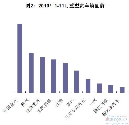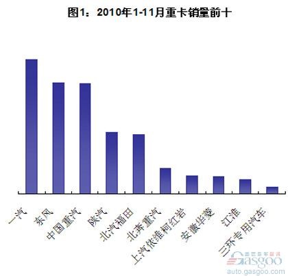 銷量前十的重卡企業(yè)為一汽、中國重汽、東風、北汽福田、陜汽、北奔重汽、上汽依維柯紅巖、安徽華菱、江淮、三環(huán)專用汽車。