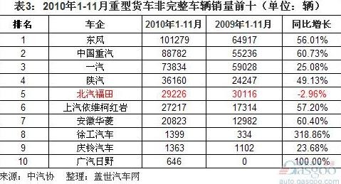 而北汽福田同比僅增長7.10%至4.10萬輛,銷量被東風超越,增速也為前十中最低。除了北汽福田,中國重汽和上汽依維柯紅巖的半掛牽引車銷量增速也低于該市場平均水平:中國重汽1-11月同比僅增52.33%至3.58萬輛,上汽依維柯紅巖增長72.49%至1906輛。