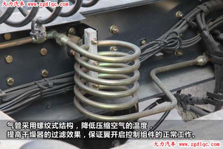 除了顏色,車身配置與之前常見(jiàn)的天龍沒(méi)有太大的差別,在大梁內(nèi)小編看到這么一個(gè)螺紋式氣管結(jié)構(gòu),這種結(jié)構(gòu)可以降低壓縮空氣的溫度,提高干燥器的過(guò)濾效果,保證翼開(kāi)啟控制組件的正常工作,天龍系列車型已經(jīng)開(kāi)始推廣此項(xiàng)改進(jìn)。