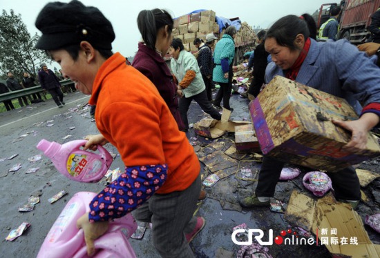 就在兩位司機(jī)等候高速公路執(zhí)法隊(duì)前來處理時(shí),高速路附近的村民發(fā)現(xiàn)后,紛紛涌入高速路上哄搶散落的貨物,氣得兩位受輕傷的司機(jī)大喊:“活搶人了……”