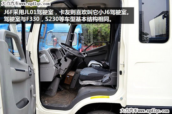 J6F采用JL01駕駛室,卡友則喜歡叫它小J6駕駛室。駕駛室與F330,S230等車型基本結(jié)構(gòu)相同。實(shí)拍車型的駕駛室寬度為1895mm,用戶可根據(jù)自己需要選裝有天窗的駕駛室。