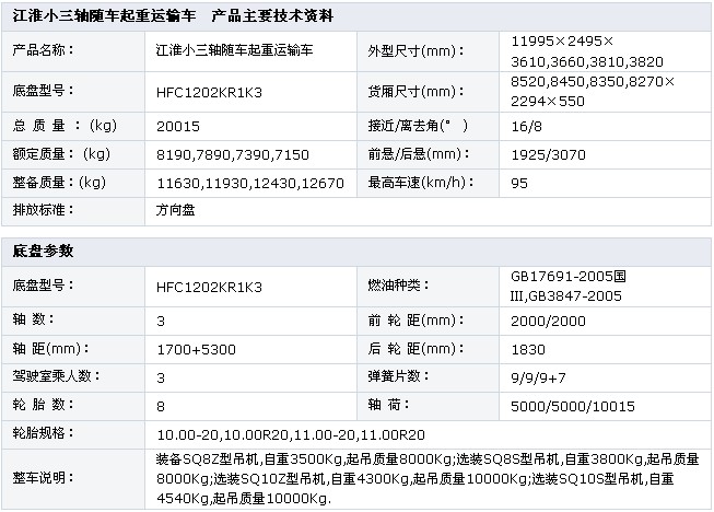 江淮小三軸隨車起重運輸車  底盤型號:HFC1202KR1K3 額定質(zhì)量:8190,7890,7390,7150