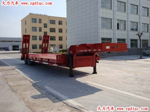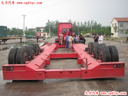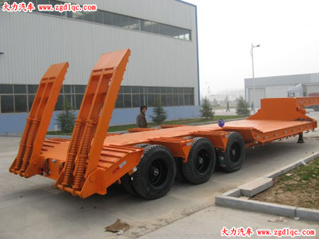 載貨部位的地板為平板結(jié)構(gòu)且無欄板的半掛車,后三橋的凹梁結(jié)構(gòu)也叫高低高,據(jù)說下圖中的這臺(tái)車重14噸,保拉100噸集中載荷,梁山某大廠出的。