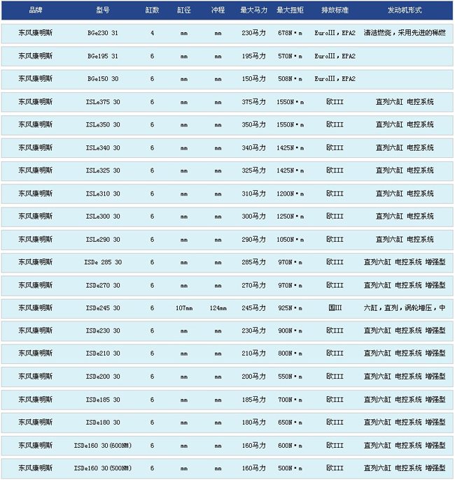 東風康明斯發(fā)動機有限公司主要生產康明斯B、C、D/L系列機械式和ISDe、ISLe、ISZ系列全電控柴油機,B系列天然氣發(fā)動機,D系列船用發(fā)電機,發(fā)動機排量為3.9L、4.5L、5.9L、6.7L 、8.3L、8.9L、13L,功率覆蓋范圍為125-545HP。
